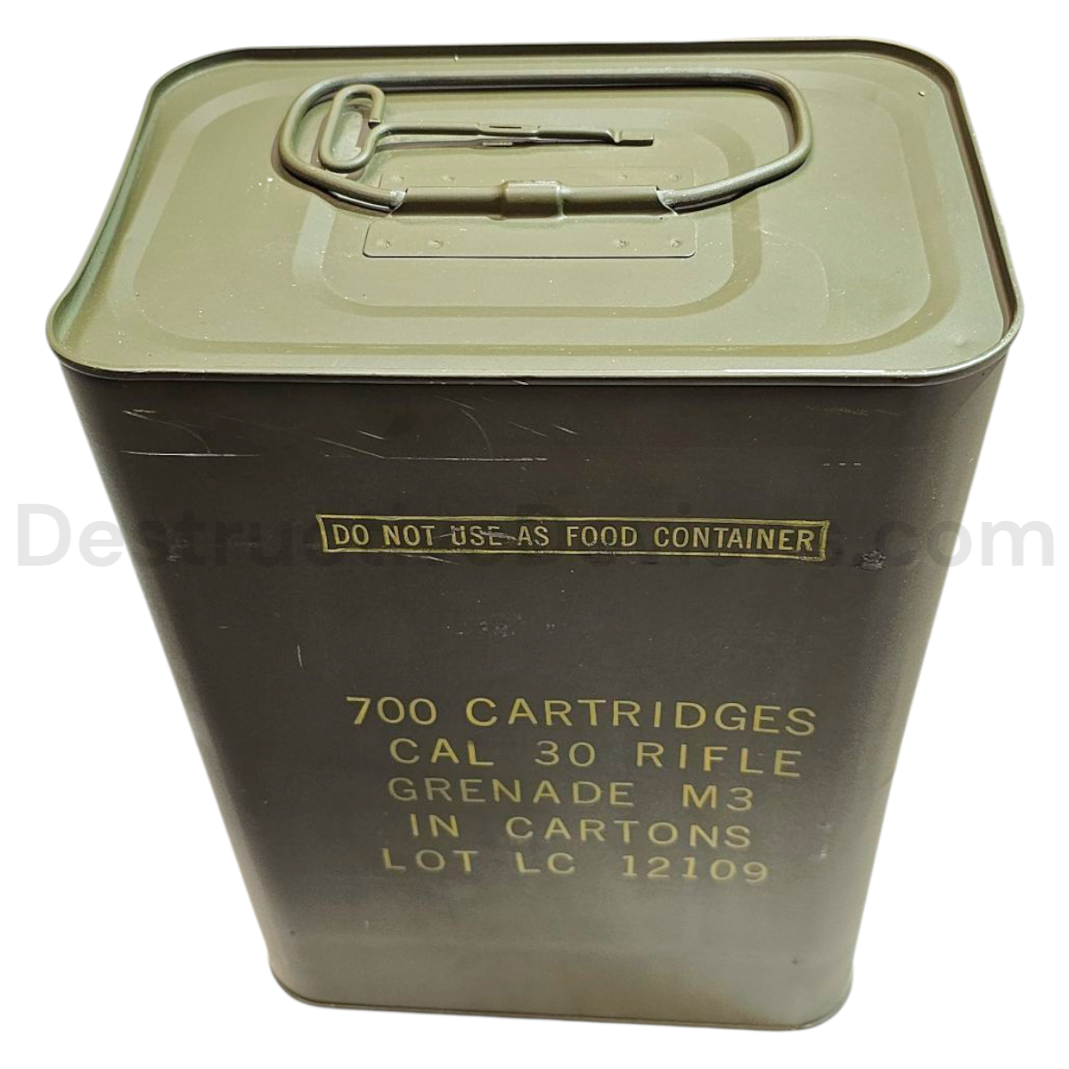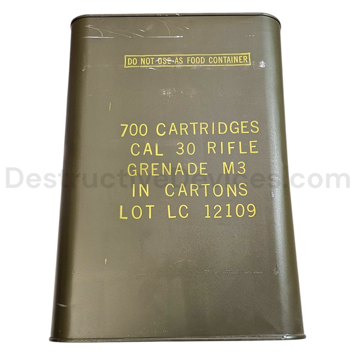 This sealed spam can contains 700 rounds of genuine M3 .30-06 Rifle Grenade Blanks, securely stored and hermetically sealed in their original military-issue can. The cartridges should remain in pristine condition due to careful storage over the decades, making this an exceptional find for collectors seeking authentic military ammunition.